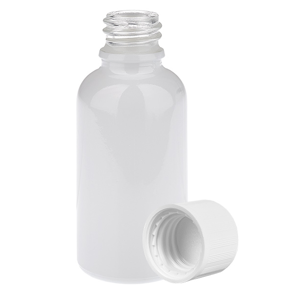30 ml Flasche mit weissem Standard Schraubverschluss & Kindersicherung (11 mm Öffnung) WhiteLine UT18/30