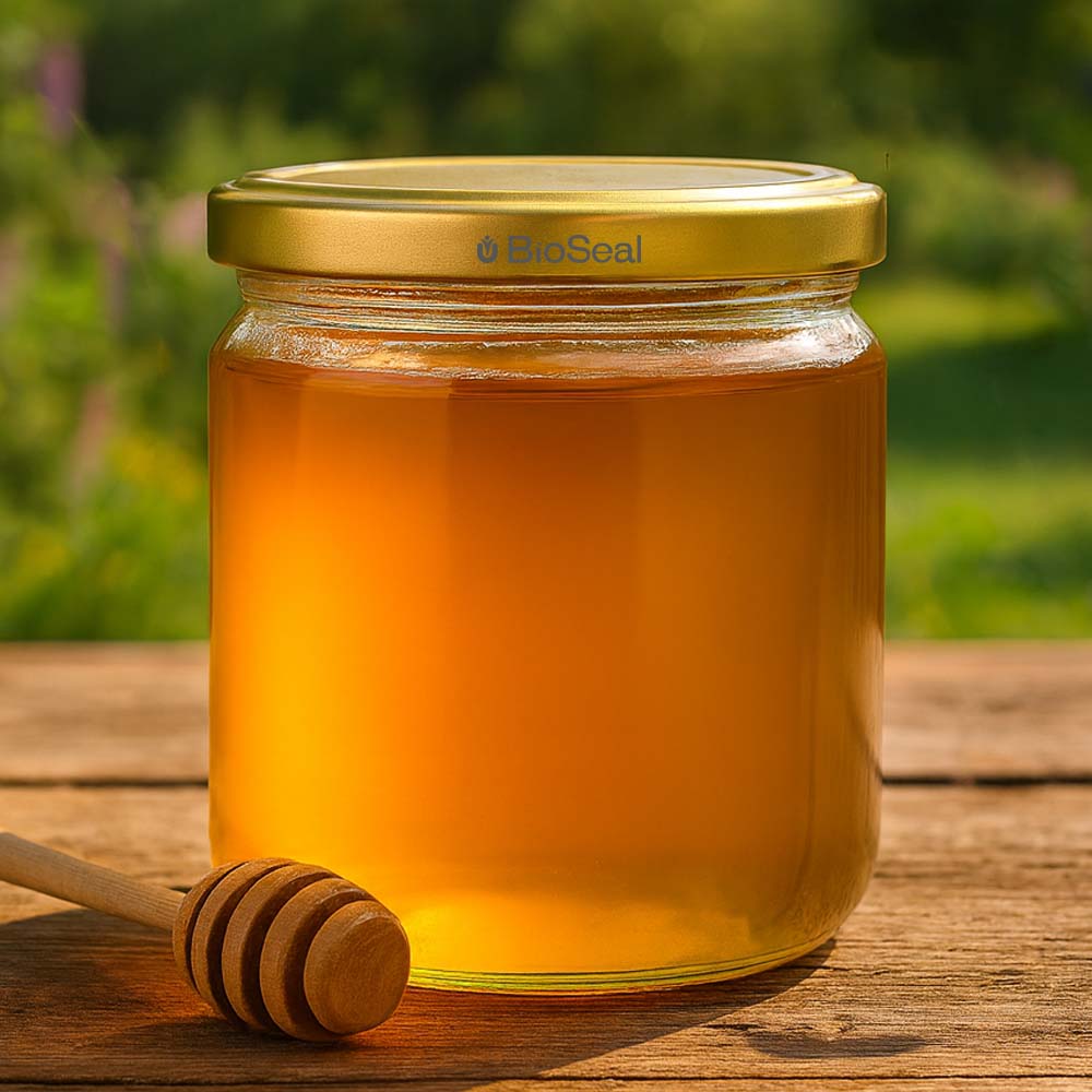 Robustes 500 g Honigglas mit goldenem BioSeal UNiTWIST-Deckel – ideal für Honigverkauf,...