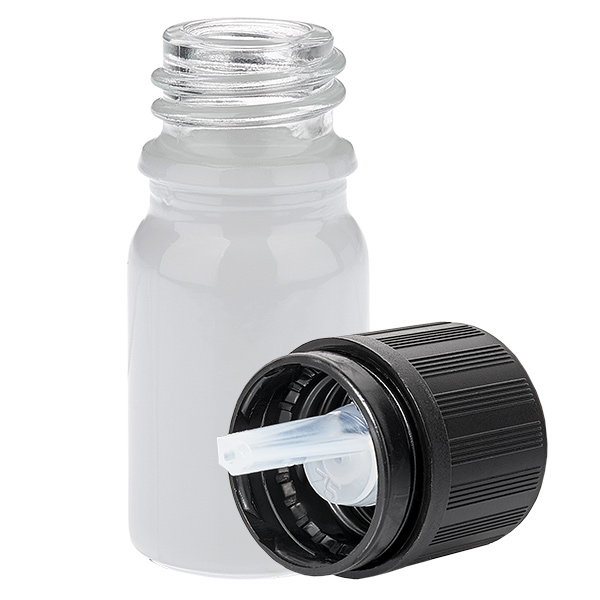 5 ml Flasche mit schwarzem Standard Tropfverschluss mit Kindersicherung (1 mm Öffnung) WhiteLine UT18/5