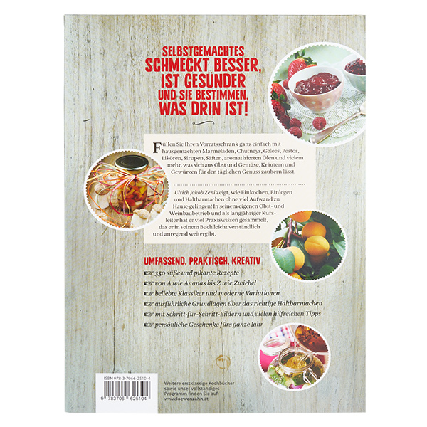 Autor Ulrich Jakob Zeni zeigt Ihnen Schritt für Schritt, wie Einkochen, Einlegen und Haltbarmachen einfach und ohne großen Aufwand gelingt. Dank seiner langjährigen Erfahrung als Kursleiter sowie aus dem eigenen Obst- und Weinbaubetrieb vermittelt er praxisnahes Wissen, das leicht verständlich ist und sofort zum Mitmachen einlädt.